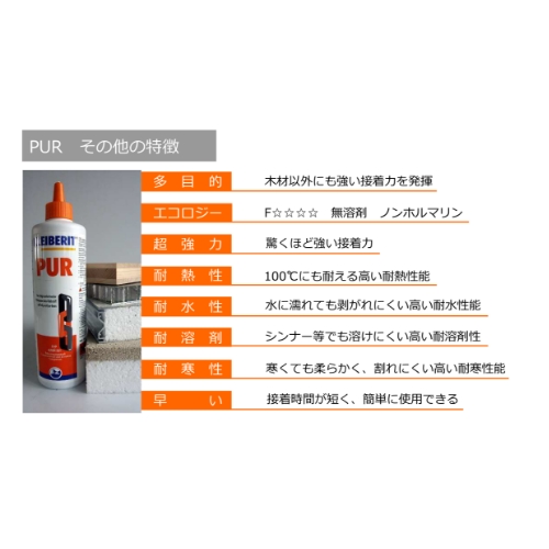 強い耐水性、耐熱性を誇ると同時に接着力も強力です。また、幅広い材料に使用でき、ノンホルマリン等安全性も非常に高い接着剤です。